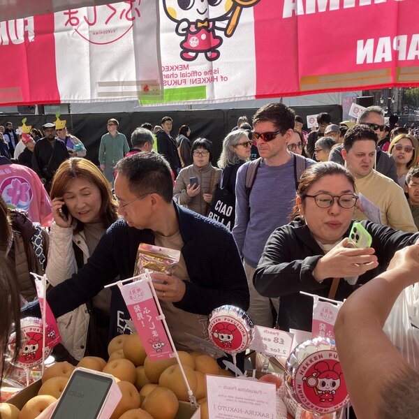 福島県のブースでは、東京電力グループが取り組む「発見!ふくしま」のロゴを広くPRし、県産農産物の風評払拭、販路拡大を図りました。ブースには長蛇の列ができ、6時間で全ての商品が完売しました。