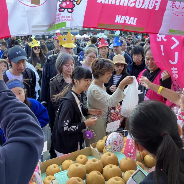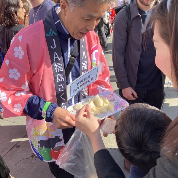 当JAいわき統括センターは9月21日、ロンドンで開かれた「ジャパン祭り2025」で「いわき梨」とミニトマト「フラガール」をPRしました。志賀組合長や同センターの営農担当者が試食販売を行い、おいしさと安全性をアピールしました。