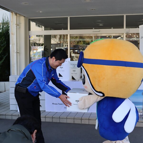 出発式では、遠藤町長や生産者、町のマスコットキャラクター「ひろぼー」から運送業者へとんぼのめがね米が手渡され、トラックが出発しました。