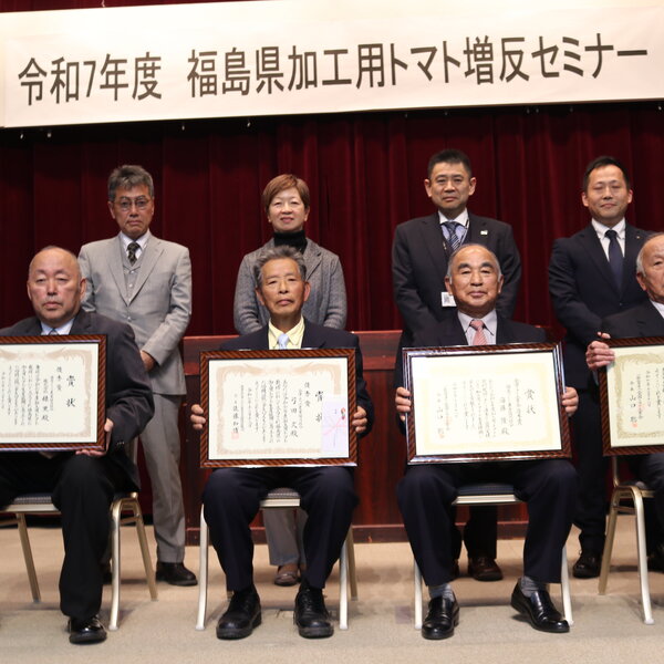 福島県加工用トマト生産安定推進協議会は12月18日、郡山市のJA福島さくら本店で令和7年度福島県加工用トマト増反セミナーを開き、今年度、県産の加工用トマト栽培で優秀な実績を残した生産者の表彰を行いました。