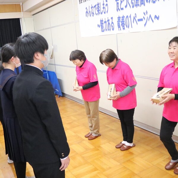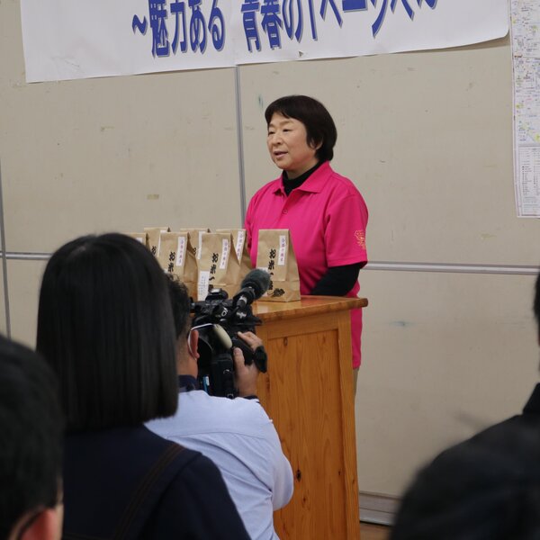 浅野雅子支部長を含む同部員3人が同校を訪れ、代表生徒に合格祈願米を手渡しました。祈願米を受け取った齊藤和真さんは「一粒一粒大切に食べて、受験に向けて頑張ります」と感謝の言葉を述べました。浅野支部長は「エネルギーを蓄えて、志望校合格を勝ち取ってほしい」と激励しました。