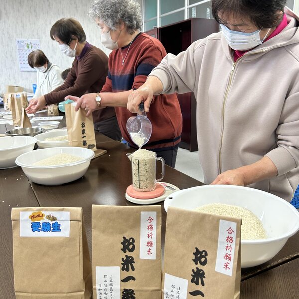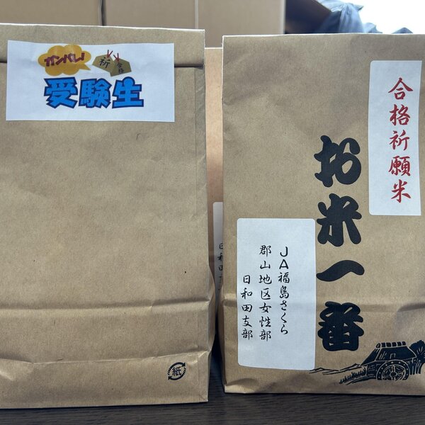 東日本大震災以降、同市産の中でも食味が高いとされる同市日和田町産米の風評被害払拭とPRを兼ねて贈呈しており、今年で12年目となりました。贈呈した米は、同支部員たちが育てた「コシヒカリ」の新米。同町の八幡神社で合格祈願を行い、JA日和田支店で同部員13人が「ゴーゴー合格」という語呂に合わせ一袋550㌘ずつ袋詰めしました。