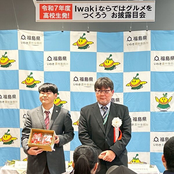 お披露目会では、レシピを考案した高校生と開発協力店が開発した商品の工夫点などを説明しました。商品を開発した高校生へ、副賞として同統括センター営農課の酒井和哉課長から「IwakiLaiki」フリーズドライ、ねぎドレッシング、サンシャイントマトドレッシング、いわき市産イチゴを贈呈しました。